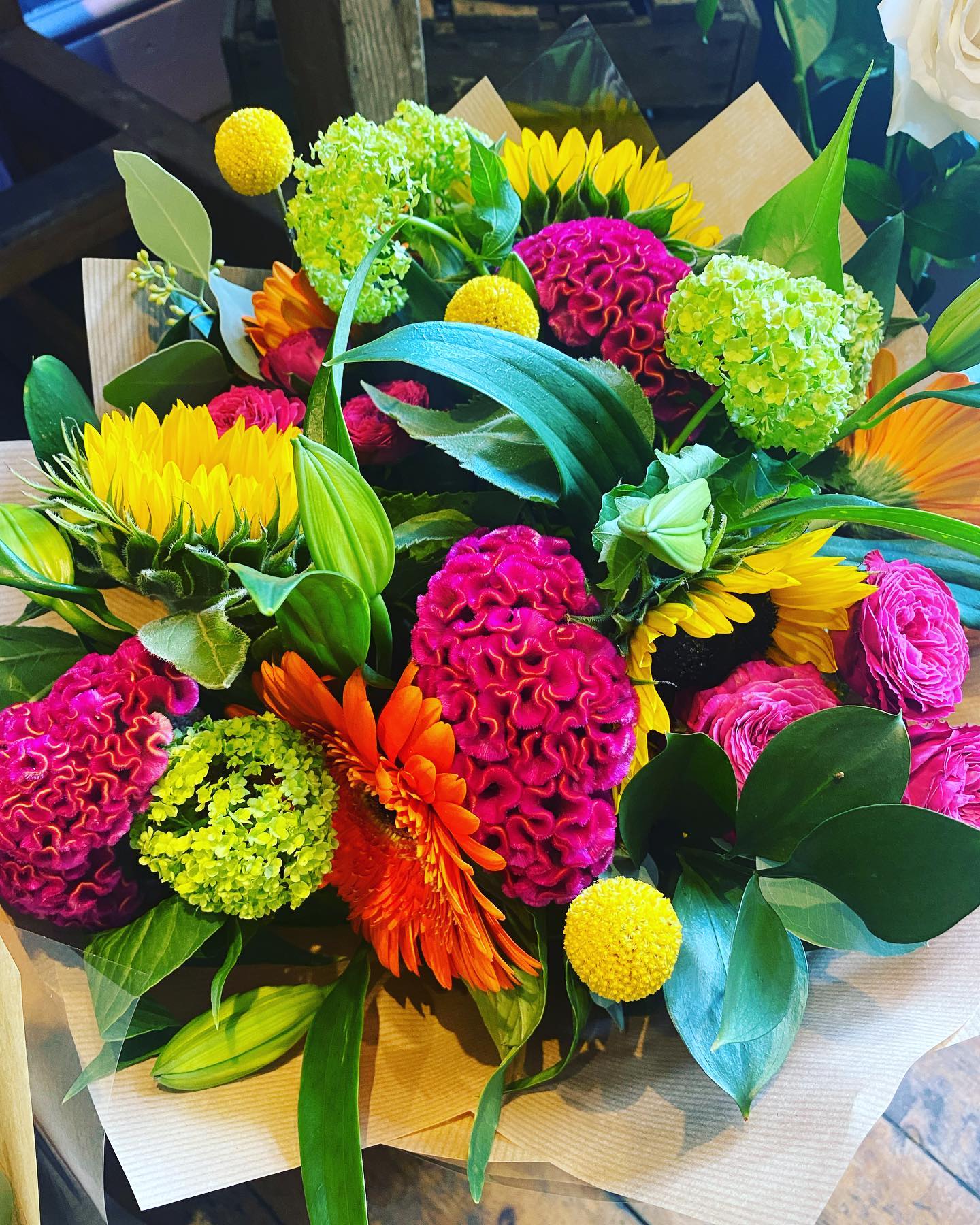 A delicious mixture of bright and fun flowers to brighten anyone's day.